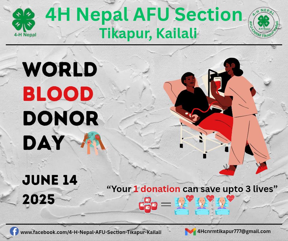 On the occasion of World Blood Donor Day ( Jestha 30, 2082), a grand blood donor registration and mass blood donation program was successfully held in Tikapur. The event was organized by the 4-H Nepal AFU Section, Tikapur, Kailali, Dari Gang Nepali...