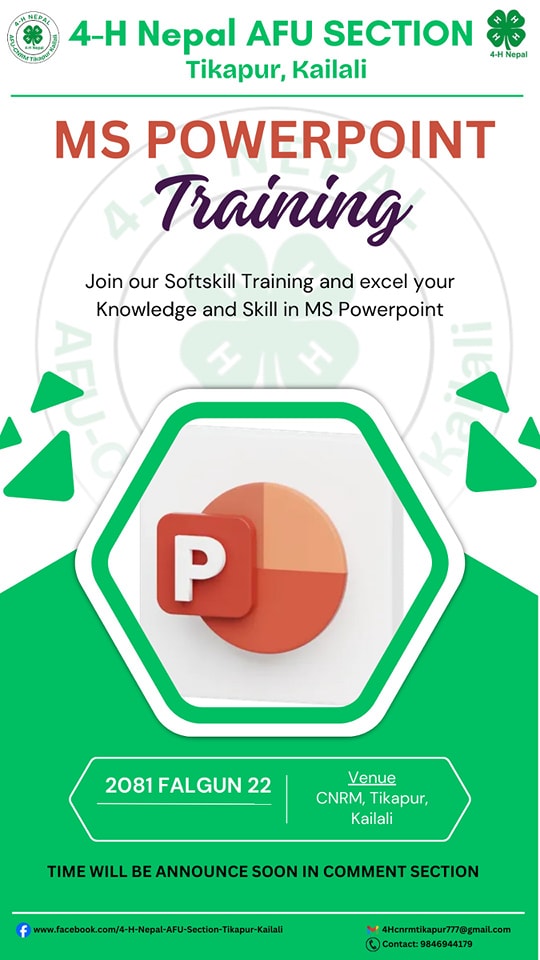 The 4-H Nepal AFU Section, Tikapur, (Falgun 22, 2081) successfully conducted "MS PowerPoint Training Session I" with participation from members of various institutions. The session was chaired by Mr. Sunesh Chaudhary and featured Assistant Professor Mr....